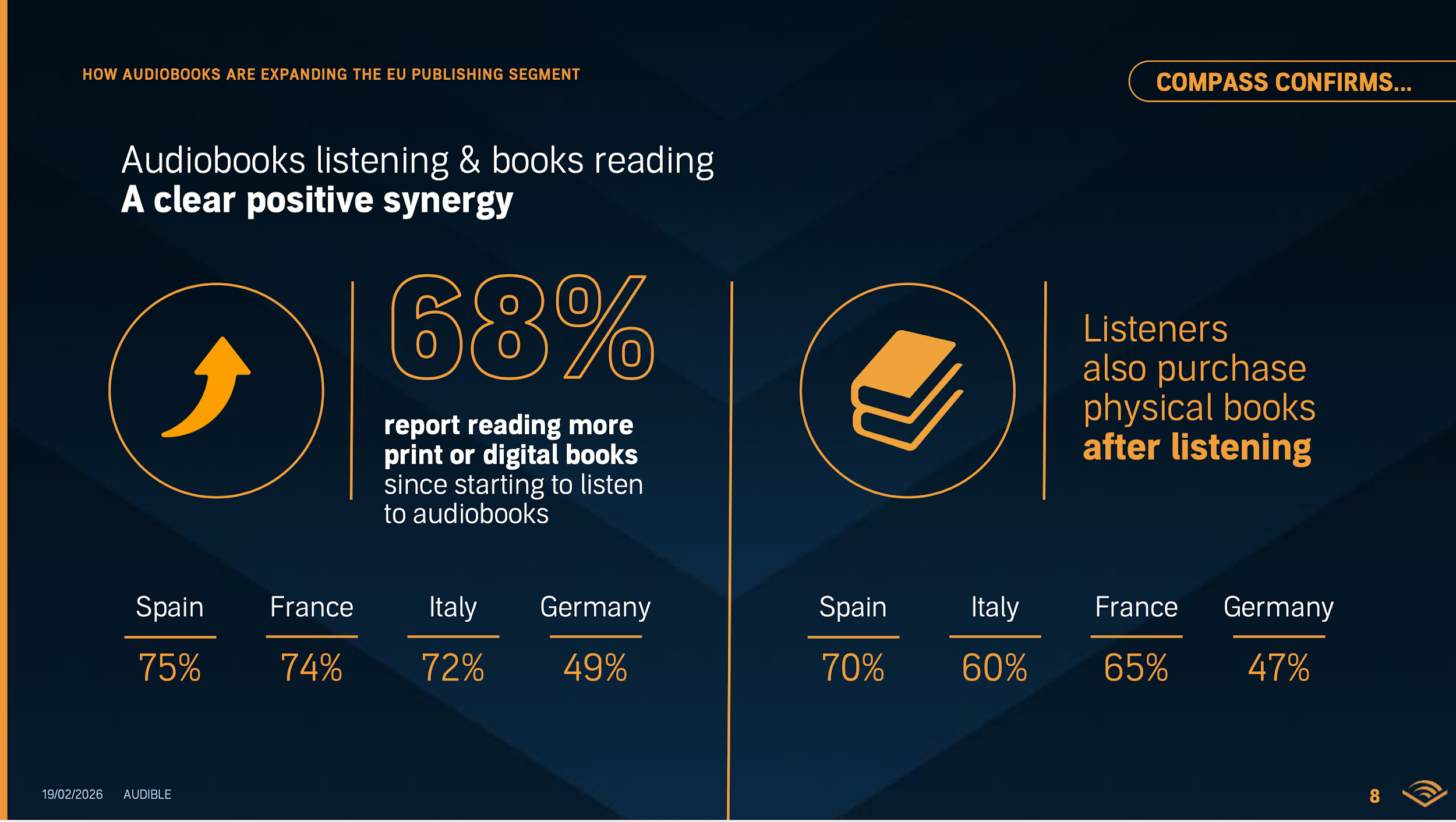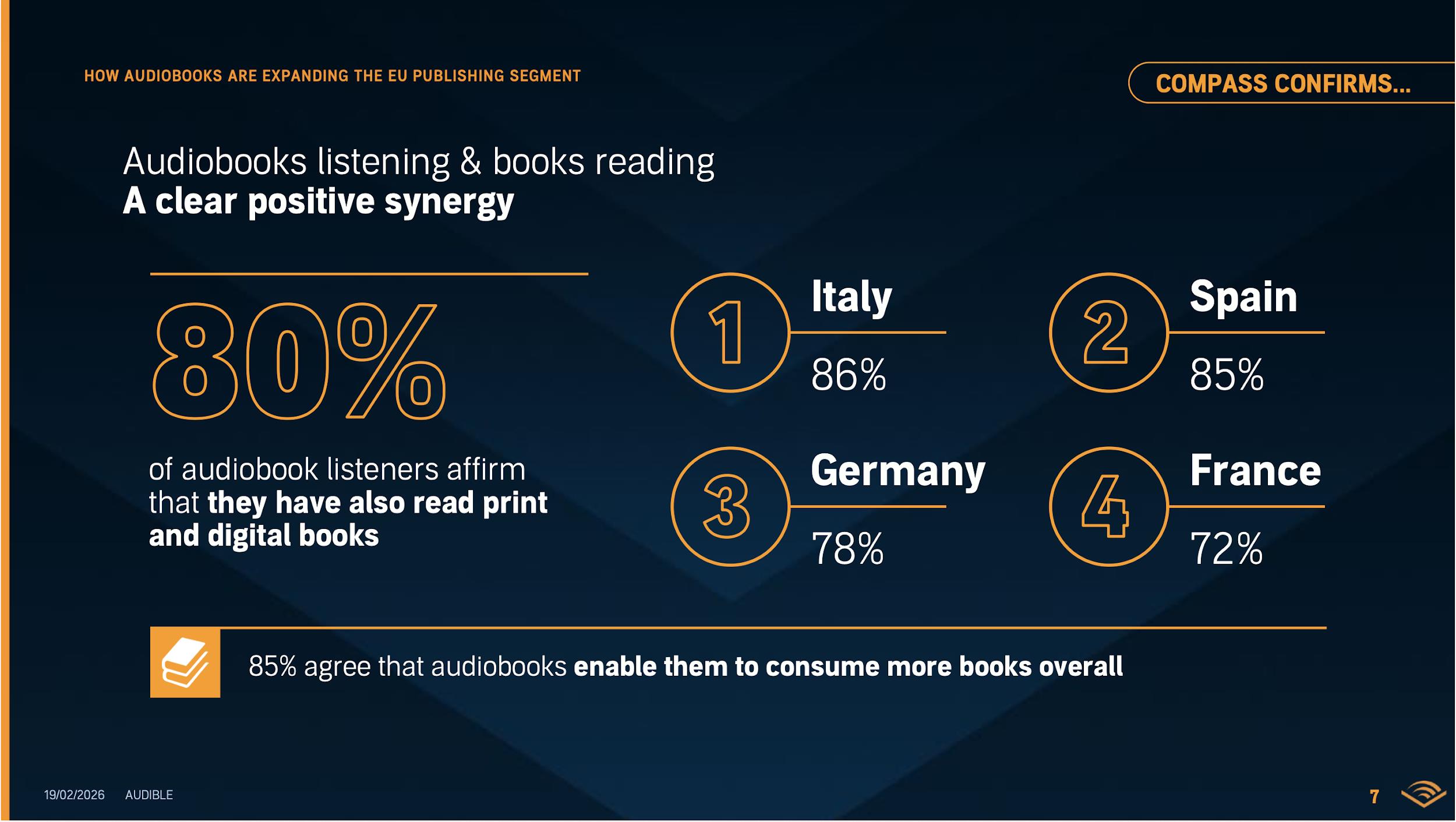 Un eje central de esta sesión fue desmontar el temor histórico a la “canibalización” entre formatos. Con la frase “keep the AND in mind”, Knabe invitaba al público a pensar el audio y el libro como formatos complementarios. Los datos respaldan esta idea de sinergia: el 80 % de los oyentes de audiolibros también son lectores (en España la cifra asciende al 85 %). Además, la mayoría de los encuestados afirman que escuchar audiolibros les ha llevado a leer más (75 % en España) o incluso a adquirir la edición impresa después de escuchar el audiolibro (70 %).
