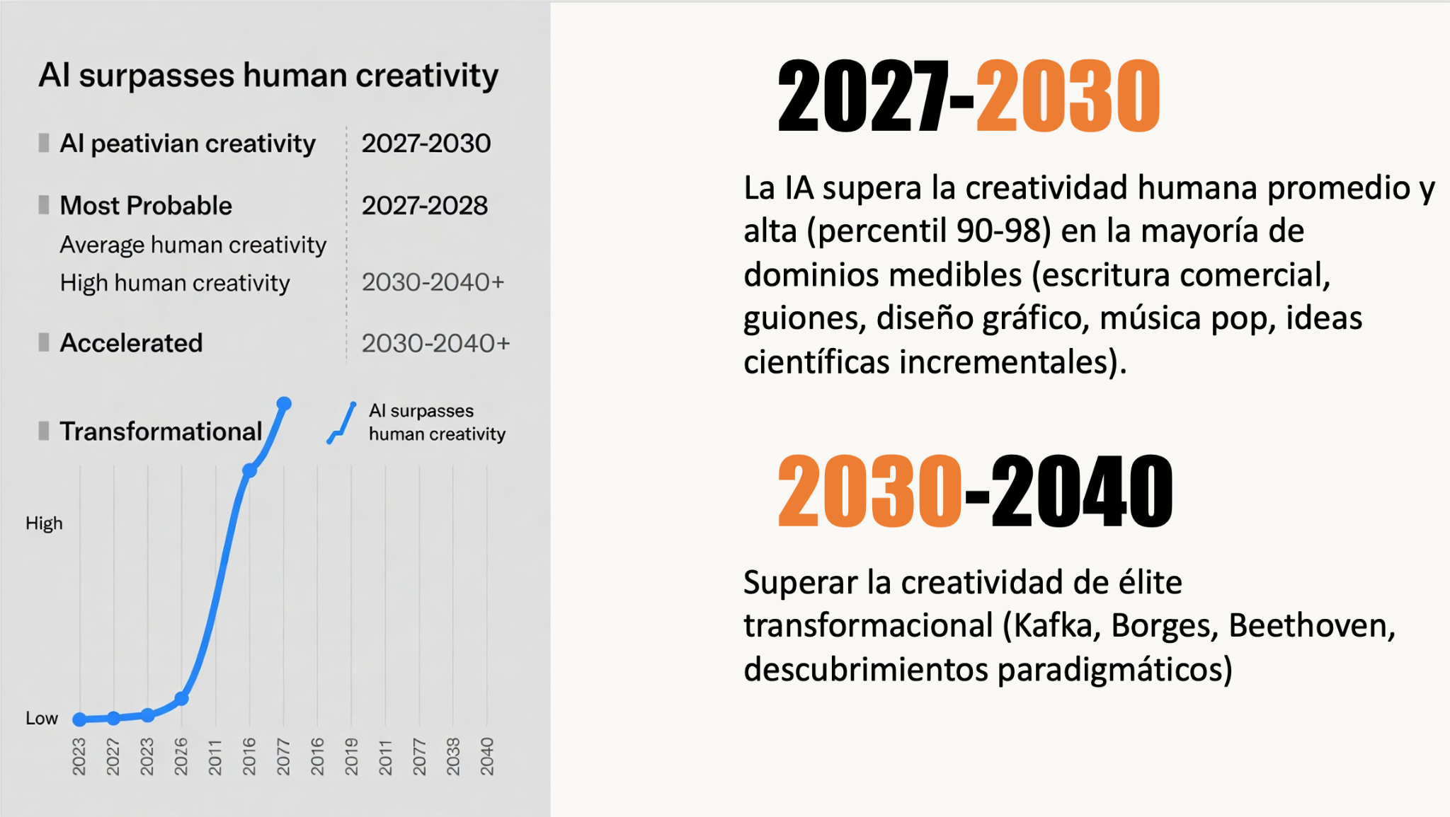 El dato perturbador —según diversos estudios recientes basados en proyecciones matemáticas— no es que estos sistemas ya compitan con los humanos en muchos procesos, especialmente en tareas de generación narrativa o ideación divergente.. sino que entre 2030 y 2040 los superarán.